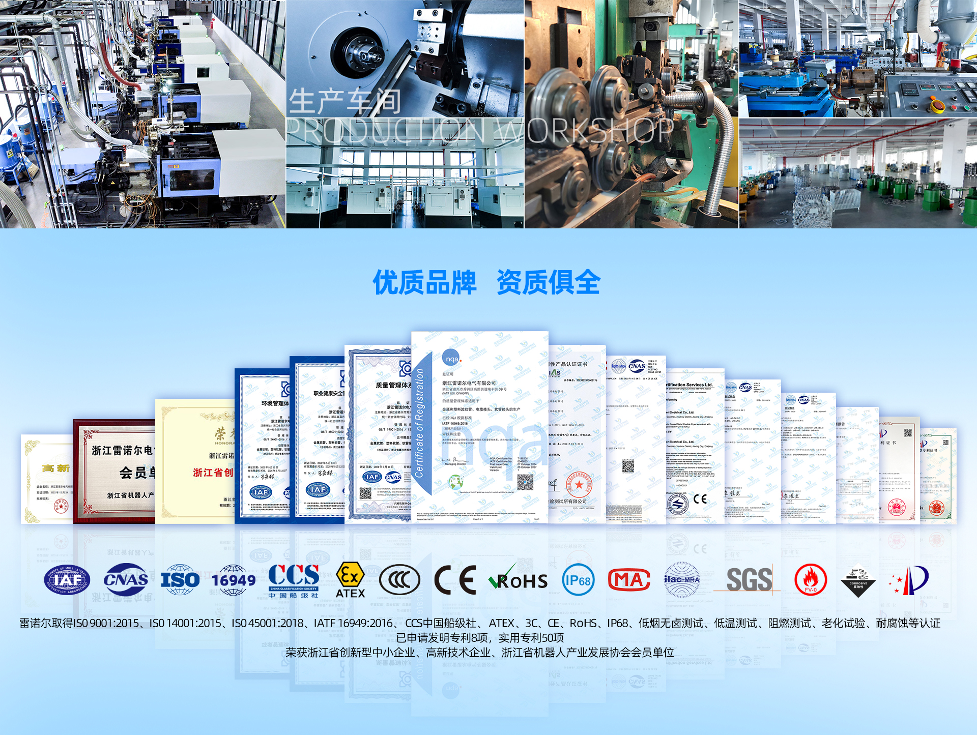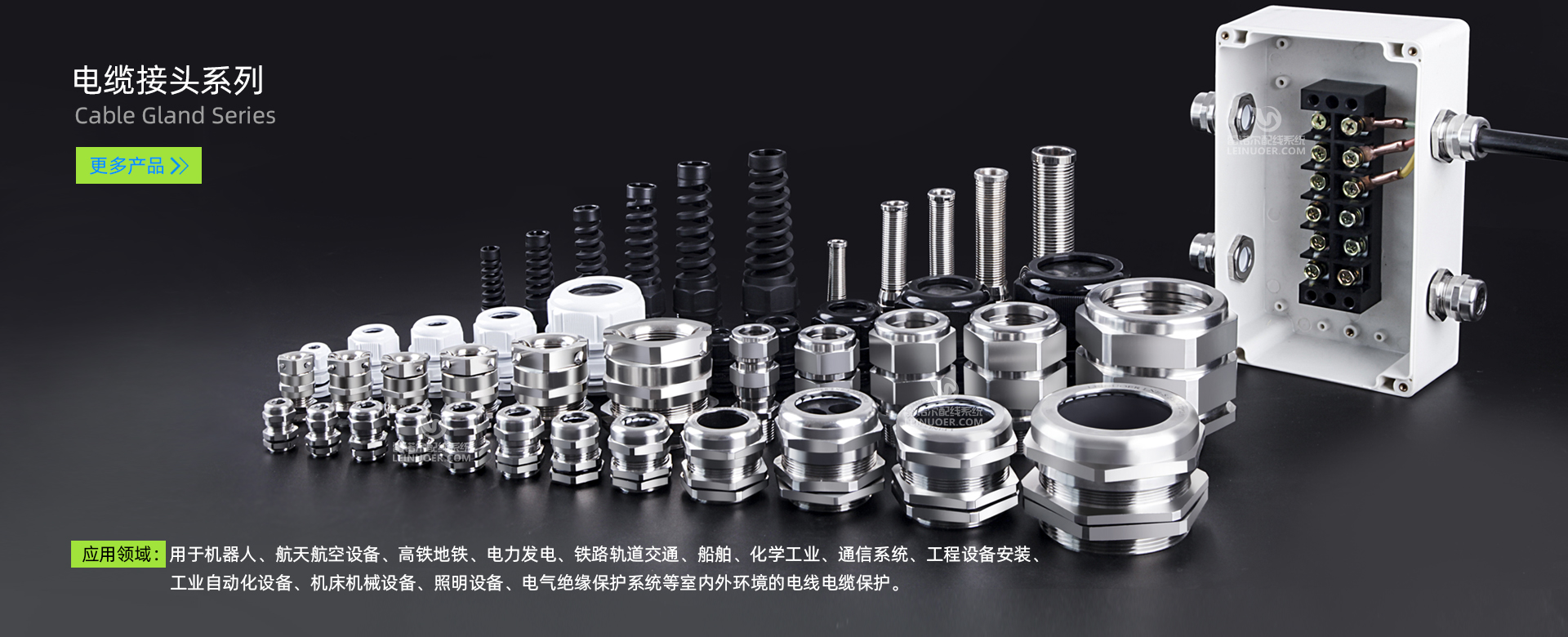 电缆接头系列LNE-RCK、LNE-SBG及金属软管系列LNE-JSPH-P4、LNE-JSGH等产品广泛适用于船舶、化工、矿业易防爆等室内外箱体、柜体和电机部位的线束保护需求。 产品通过UL94-2020阻燃测试以及环保RoHS认证、欧盟CE认证。 电缆接头系列LNE-K、LNE-KD、LNE-KFW、LNE-RCK、LNE-SBG等产品可以满足电机、控制器以及高