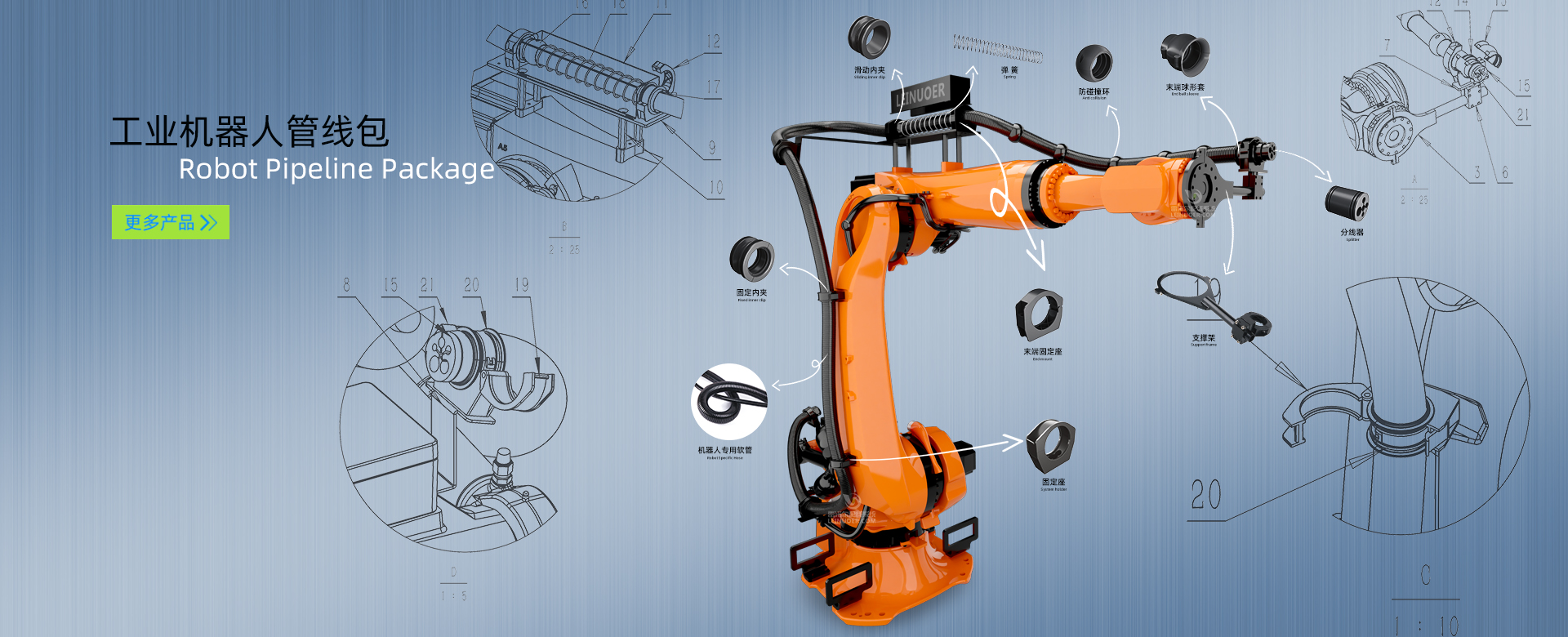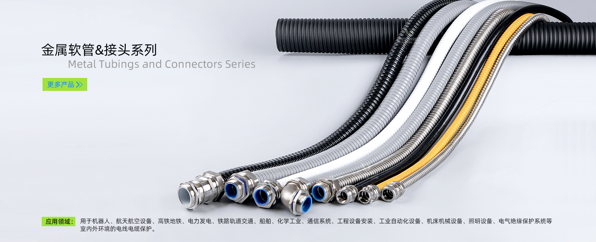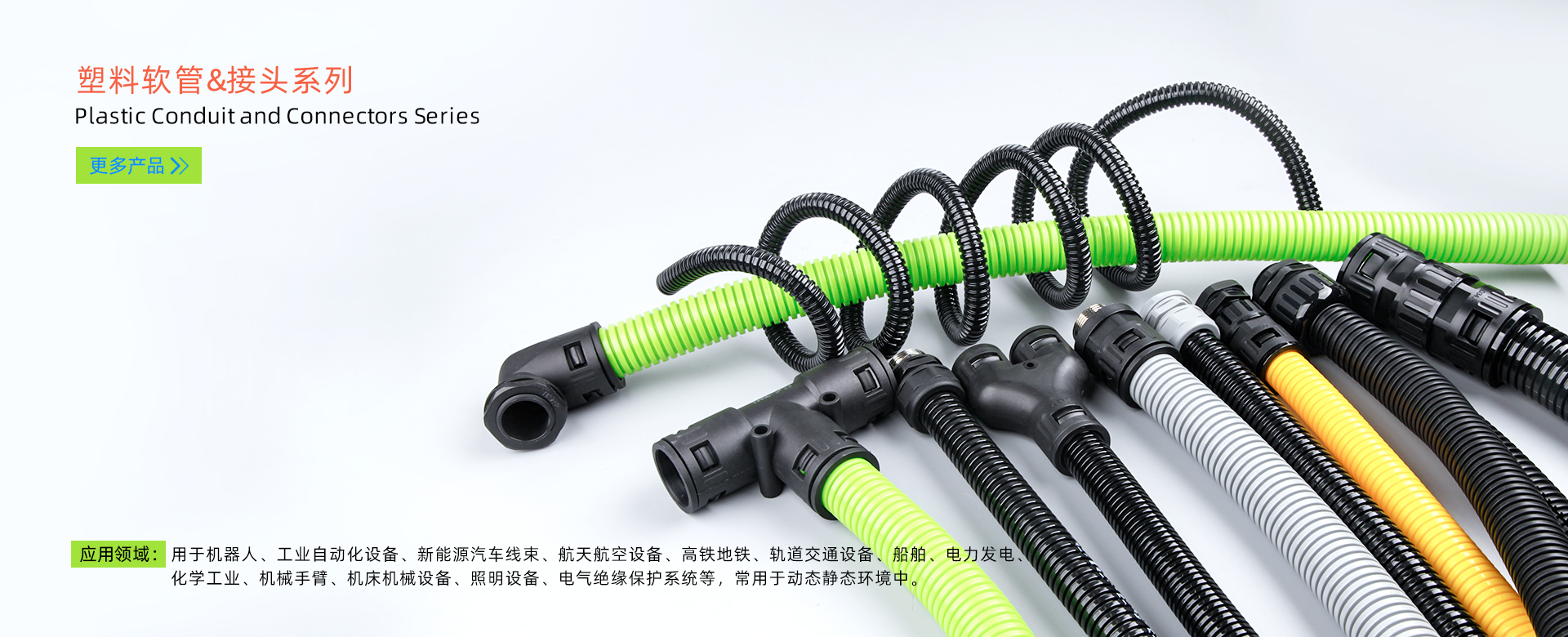 围绕“电气保护”的产品宗旨,J9官网推出多款优质的工业保护软管及配套的电气连接器,我们的产品可广泛应用于机器人自动化、环保(汽车)设备制造、机械手臂、电力通讯、轨道交通、建筑基建等多行业,为智能化、自动化设备的电线电缆提供必要的保护。